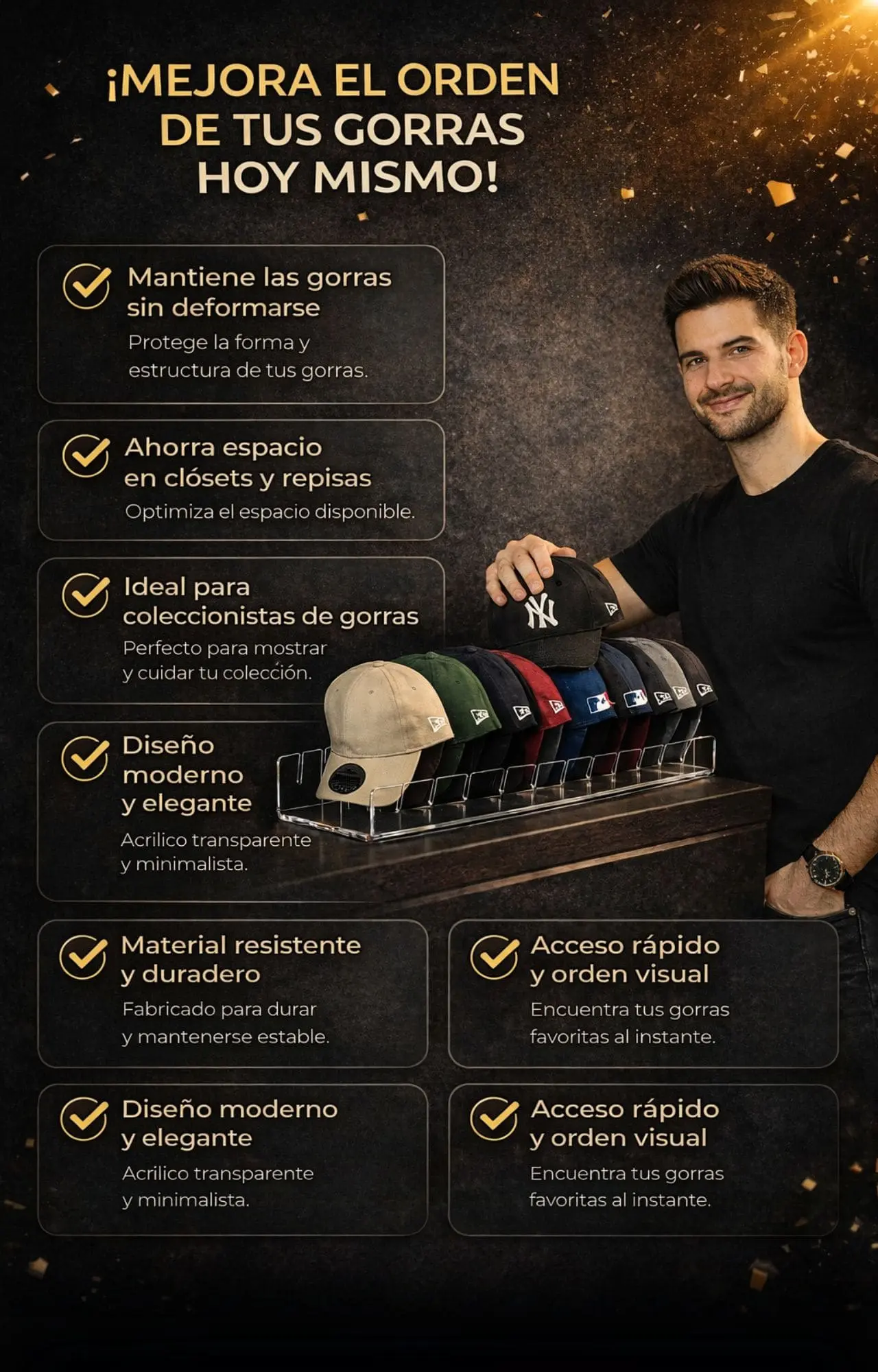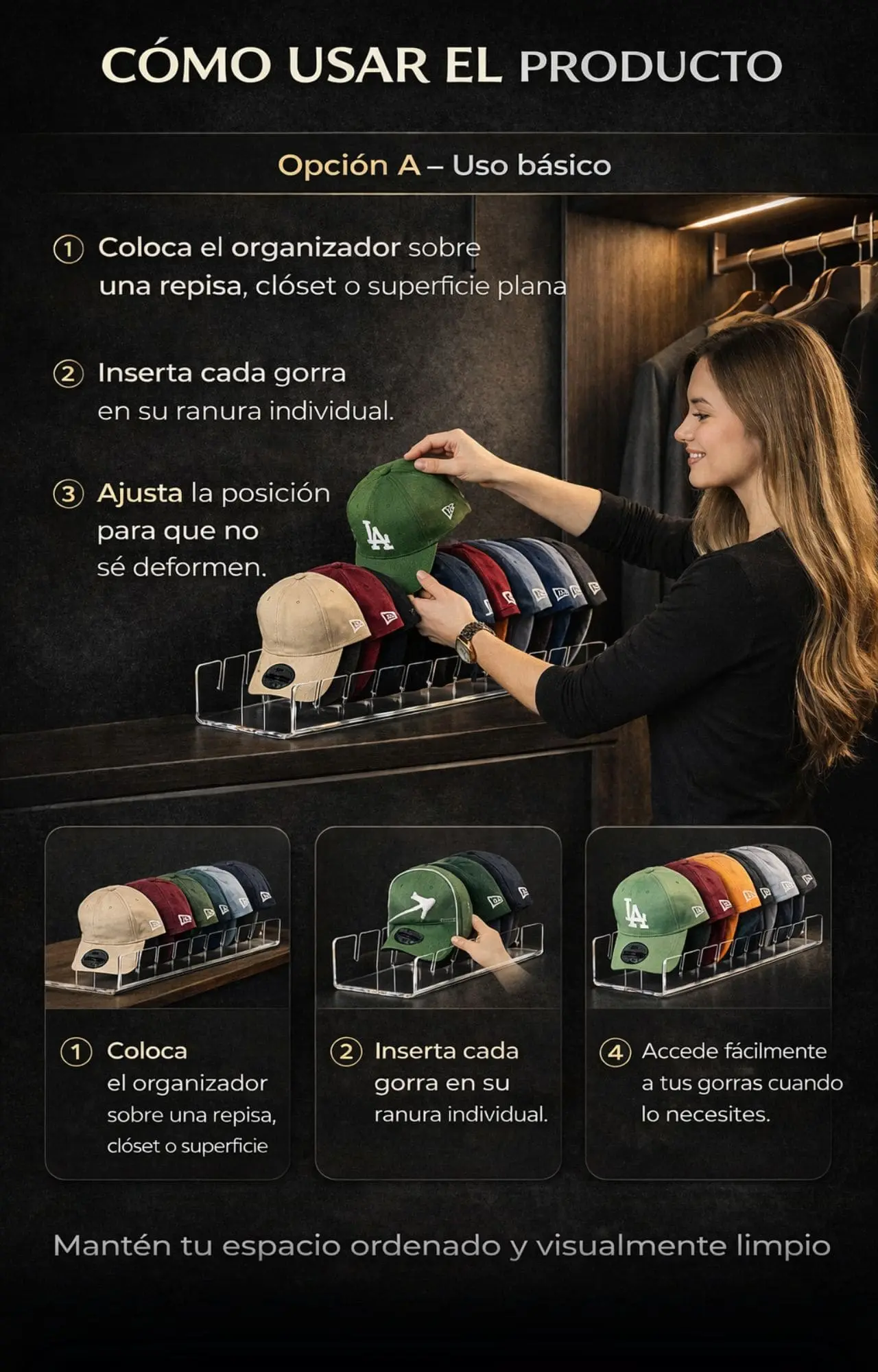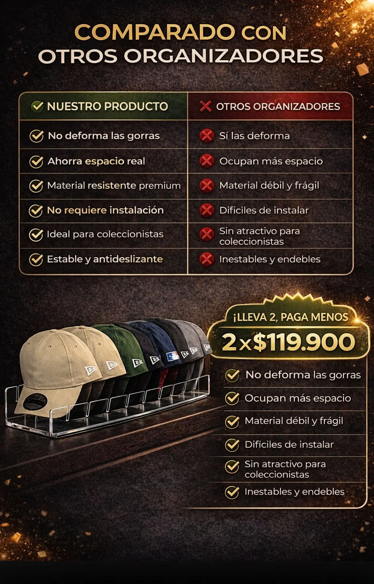 Cada organizador permite almacenar varias gorras de forma ordenada y visible, sin que se deformen. Es ideal tanto para uso diario como para coleccionistas que quieren mantener sus gorras en perfecto estado.
