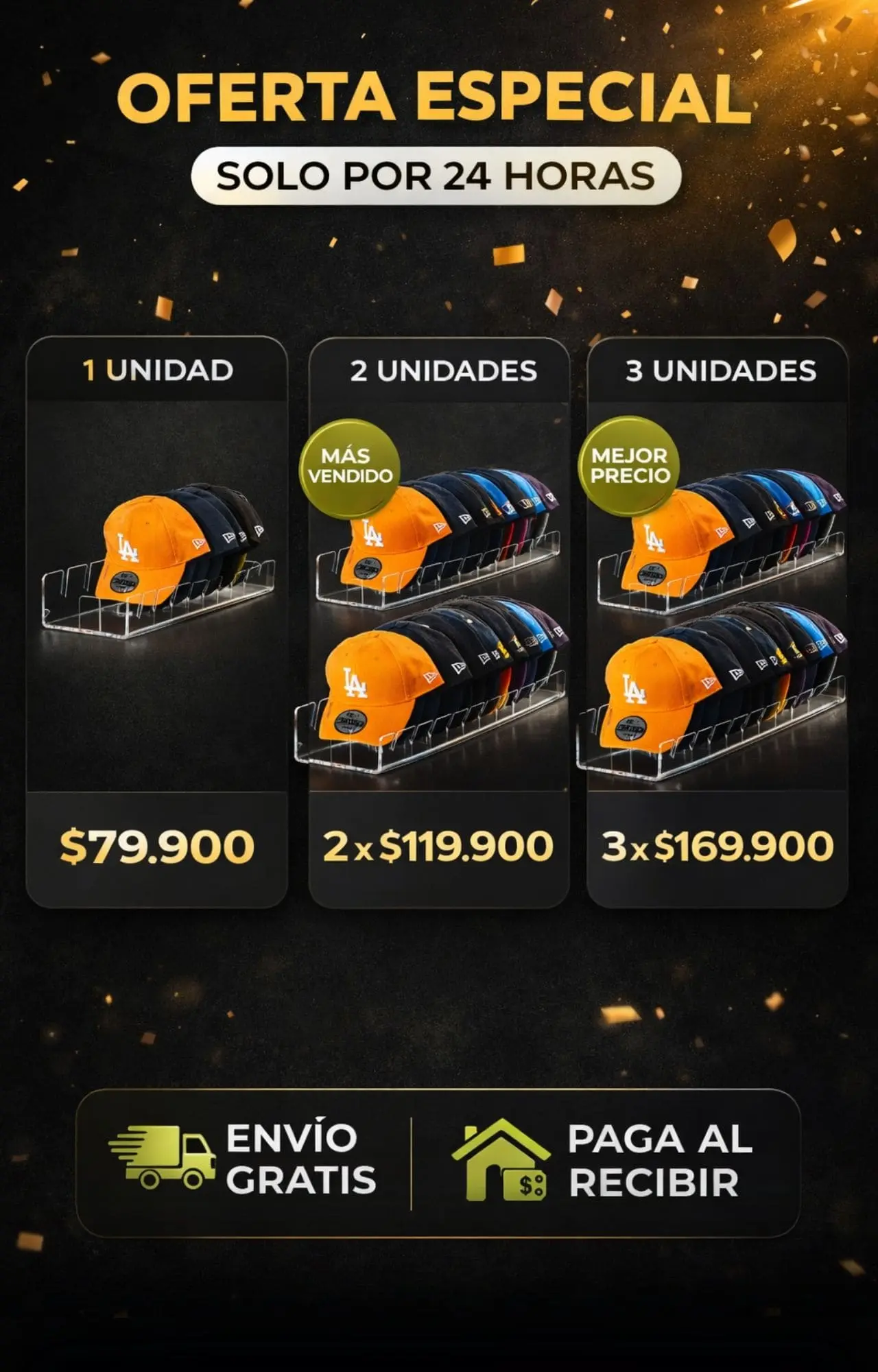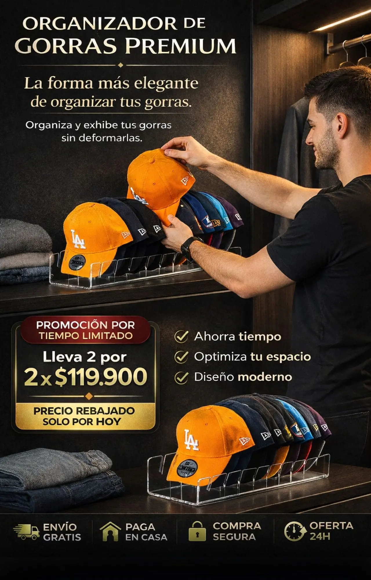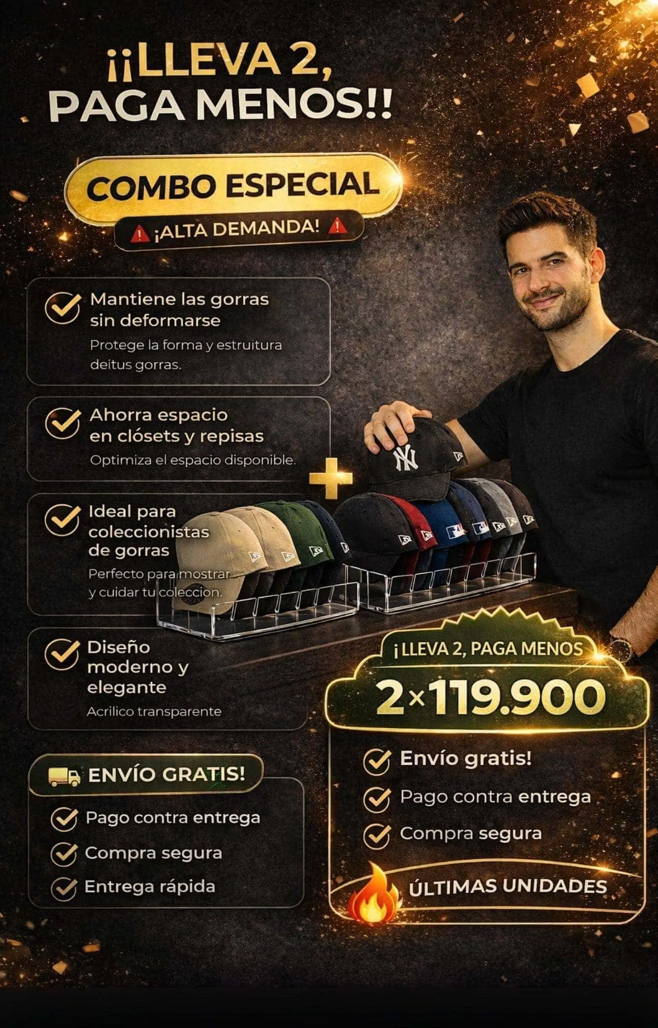 Cada organizador permite almacenar varias gorras de forma ordenada y visible, sin que se deformen. Es ideal tanto para uso diario como para coleccionistas que quieren mantener sus gorras en perfecto estado.
